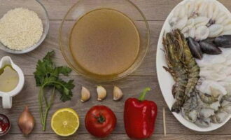 Verhit de olijfolie in een paellapan, leg de garnalen in schelpen, inktvis en mosselen erin. We bakken alles ongeveer 3 minuten op matig vuur.