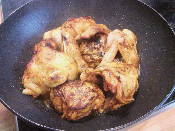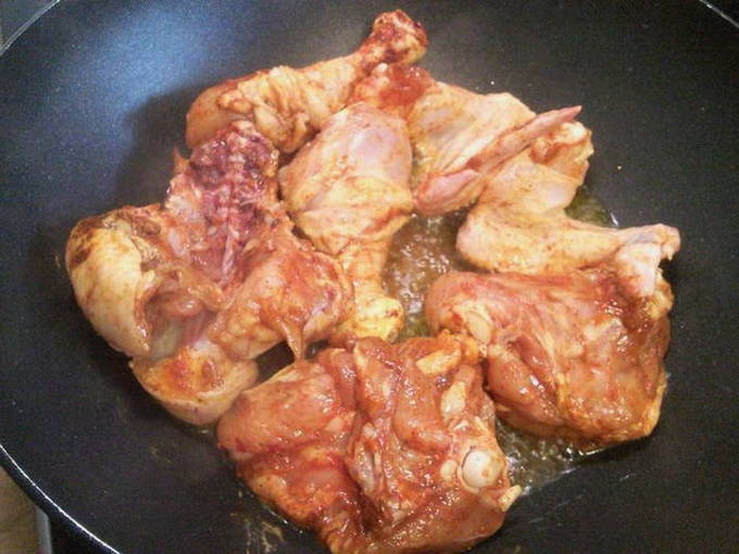 - Bak de ingelegde stukjes kip in verwarmde olijfolie aan beide kanten goudbruin.We leggen ze op een apart bord en zetten apart.
