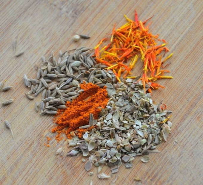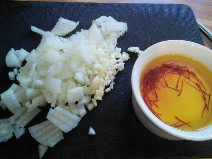 - Hak de knoflook en ui fijn, giet de saffraan met kokend water.