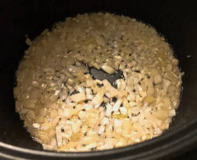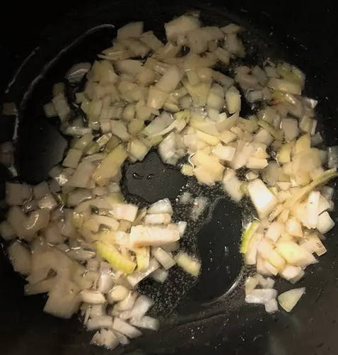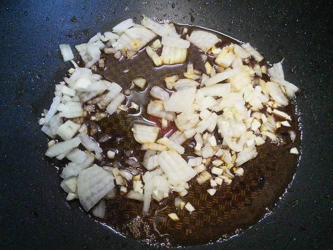 - Alles in dezelfde olie waarin de kip gebakken was, fruit de knoflook en uien.