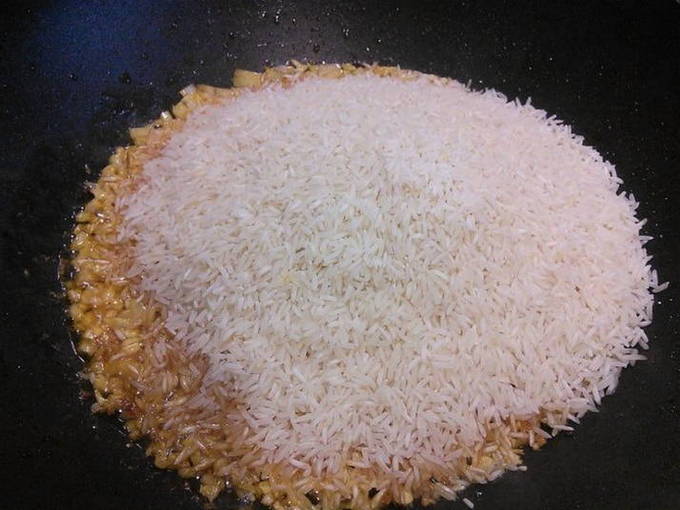 - Voeg rijst toe aan de pan en bak deze, af en toe roerend, ongeveer 3 minuten.