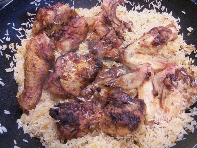 - Doe vervolgens de gebakken stukjes kip terug in de pan en leg ze op de rijst.