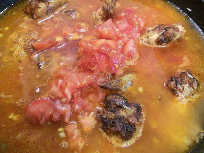 - Vul het voedsel met hete kippenbouillon en saffraan met kokend water. Voeg de tomaten samen met het sap toe en laat alles samen onder het deksel ongeveer 10 minuten sudderen.