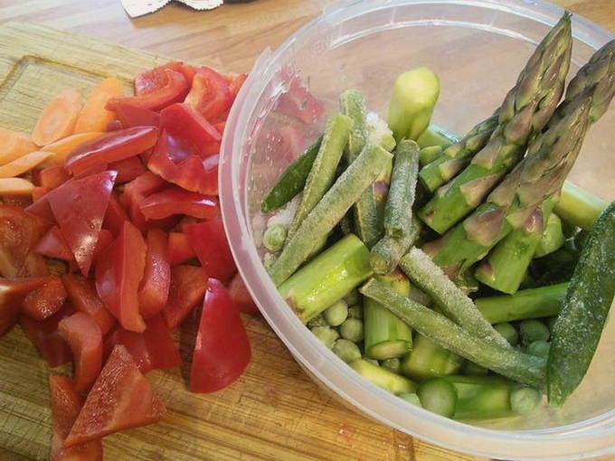 - We bereiden alle benodigde ingrediënten voor, ontdooien groenten indien nodig.