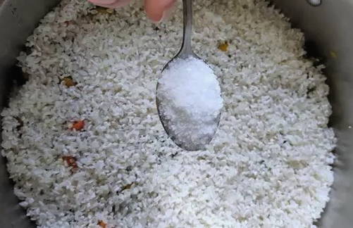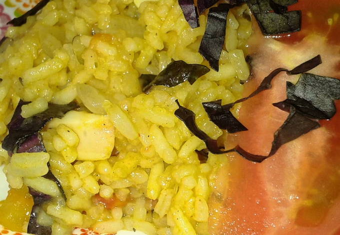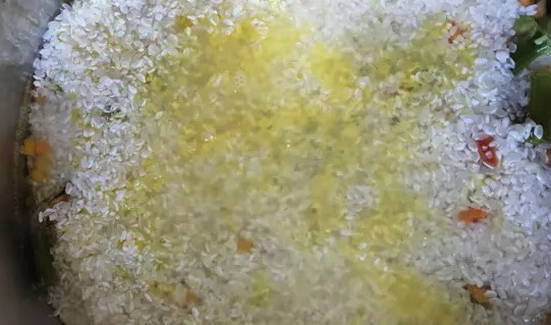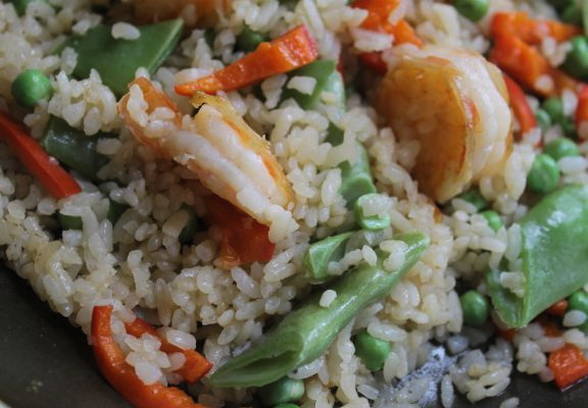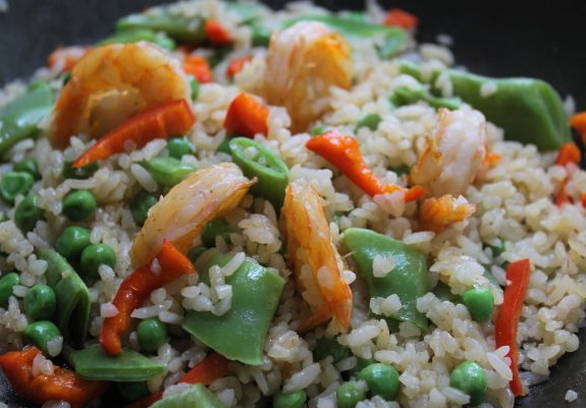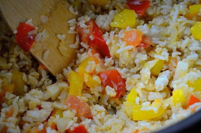 - Doe de rijst in een koekenpan, meng alle ingrediënten en bak ze ongeveer 6 minuten.