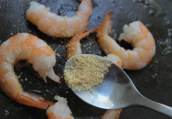 - We pellen de garnalen en bakken ze 3 minuten in olie met de toevoeging van gehakte of droge knoflook.