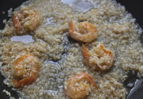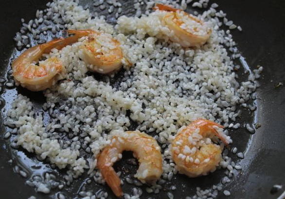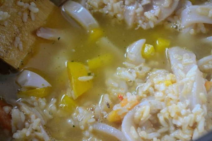 - Giet vervolgens de rijst met wijn en breng aan de kook, voeg dan de inktvis en kruiden toe en meng alles goed.