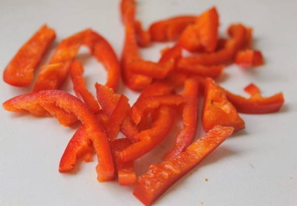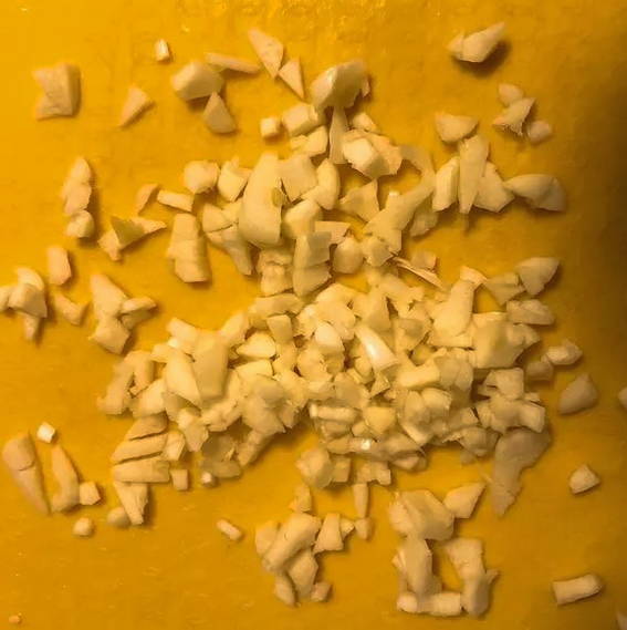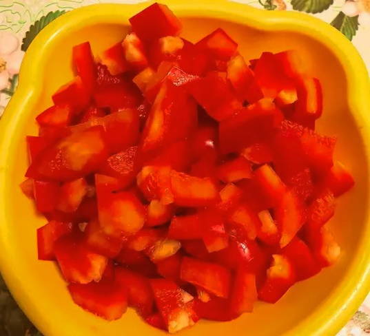 - Snijd de knoflook, ui en paprika in kleine stukjes.