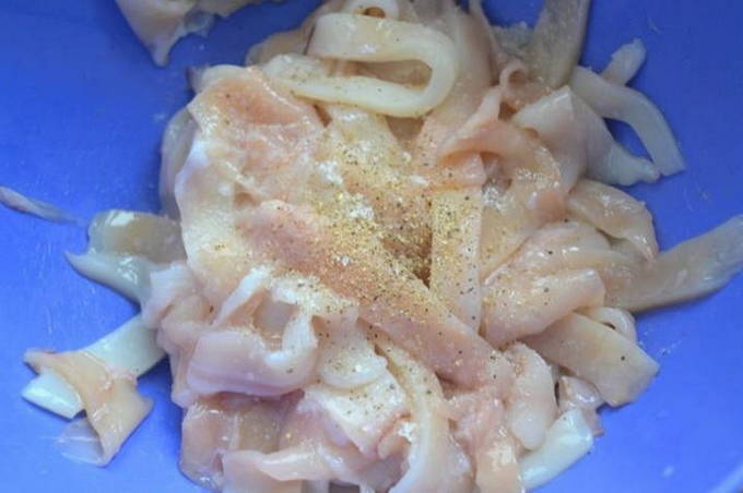 - Snijd de inktvisfilets in reepjes, bestrooi met peper en zout en laat marineren.