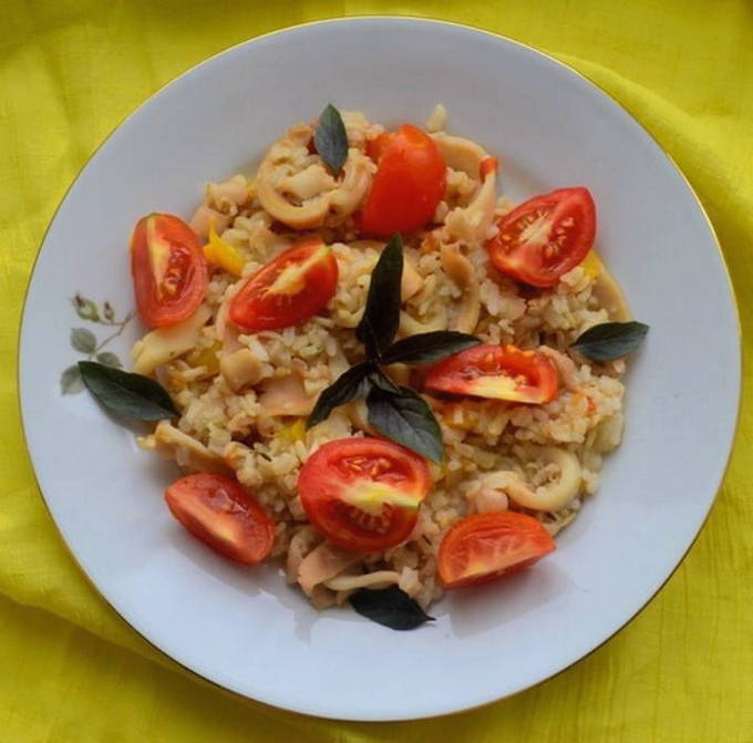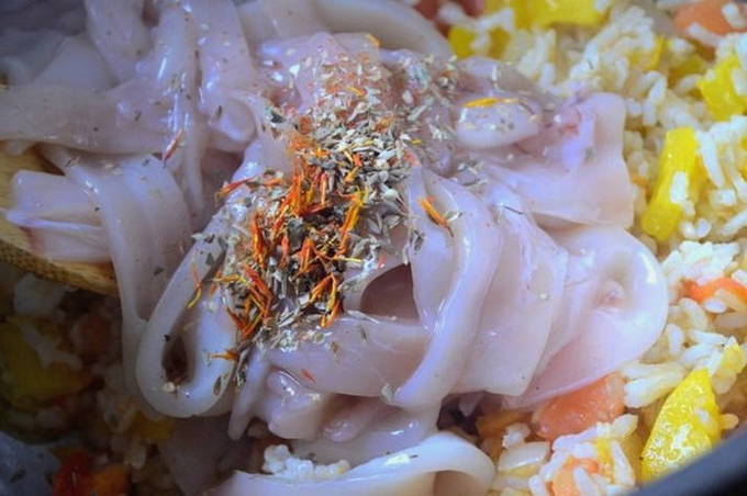 Giet de geweekte saffraan in de pan, voeg gehakte tomaten en een halve liter garnalenbouillon toe. Peper en zout het gerecht naar smaak, breng het vocht aan de kook en voeg rijst toe. Meng de ingrediënten en kook ongeveer 15 minuten. Voeg vervolgens de gesneden inktvis en de overige garnalen toe. Ga door met het koken van de paella tot al het vocht is verdampt.