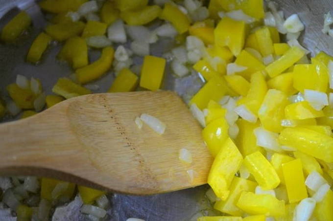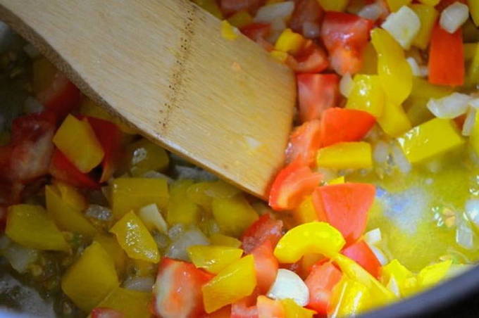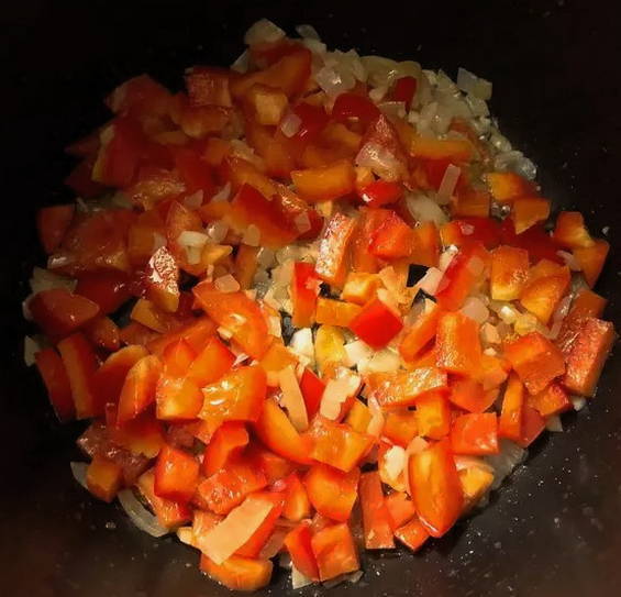 - Verhit de olijfolie in een pan met dikke bodem en fruit hierin de knoflook, ui en paprika.