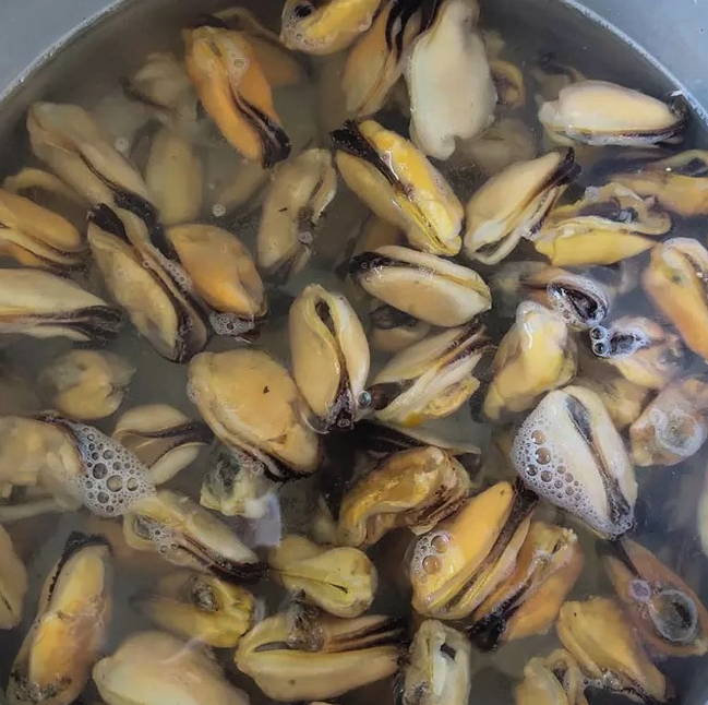 - Vul de mosselen met koud water, breng aan de kook, kook ze nog 2 minuten en giet het water af.