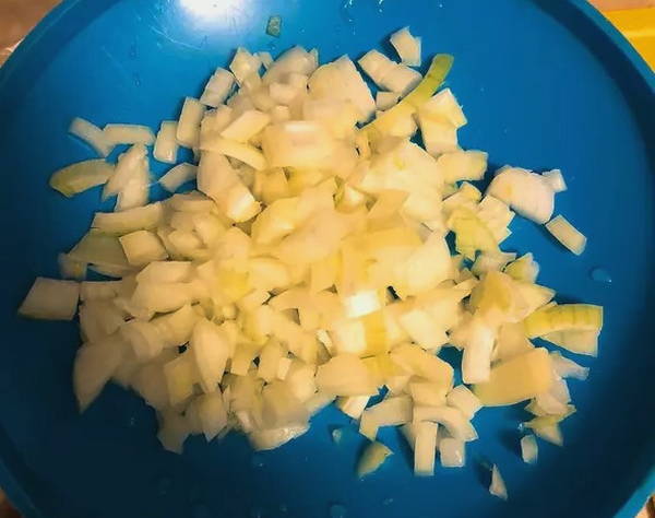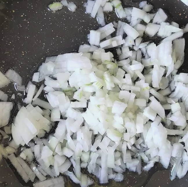 - Snijd de ui in kleine vierkantjes en leg deze op de olie die in een koekenpan is verwarmd.