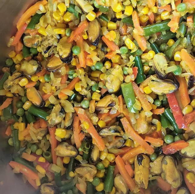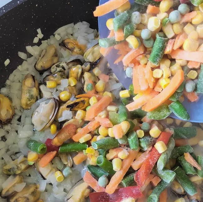 - Voeg na de mosselen de groenten toe en laat alles, onder af en toe roeren, ongeveer 10 minuten sudderen.