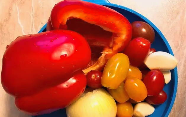 Snijd de knoflook in kleine blokjes. We wassen de paprika's, schillen en snijden in grote stukken. Snijd de sjalotten in halve ringen. Snijd en hak de peterseliestengels.