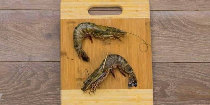 We wassen de ongepelde garnalen en verwijderen hun binnenkant, waarbij de schaal overblijft.