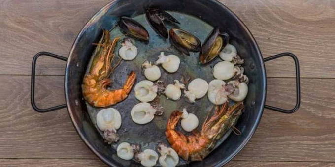 Verhit de olijfolie in een paellapan, leg de garnalen in schelpen, inktvis en mosselen erin. We bakken alles ongeveer 3 minuten op matig vuur.