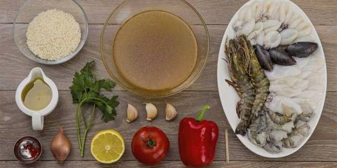 Doe rijst en geraspte tomaten in een koekenpan. Giet de inhoud met saffraan en water, evenals de bouillon die overblijft van de garnalen. Voeg zout en kruiden toe. Kook gedurende 15 minuten op laag vuur.