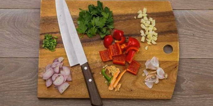 - Snijd de paprika, ui en knoflook fijn. We sturen producten naar een koekenpan met plantaardige olie.