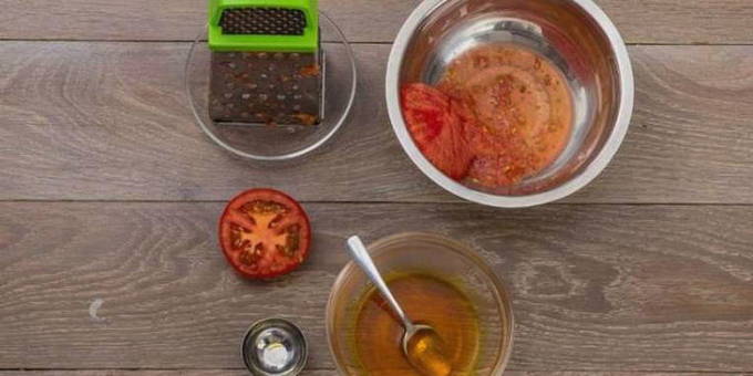 Snijd de tomaat doormidden en rasp ze. Giet de saffraan met een kleine hoeveelheid kokend water en laat 5 minuten staan.