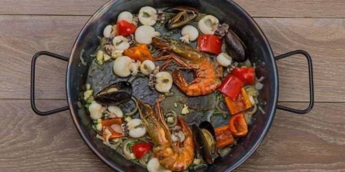 - Paella met kip en zeevruchten is klaar. Verdeel het in porties en serveer.