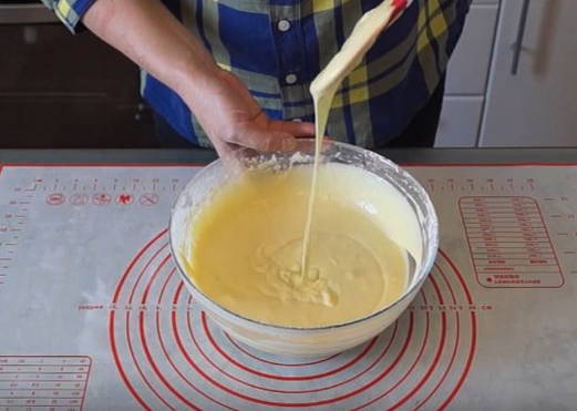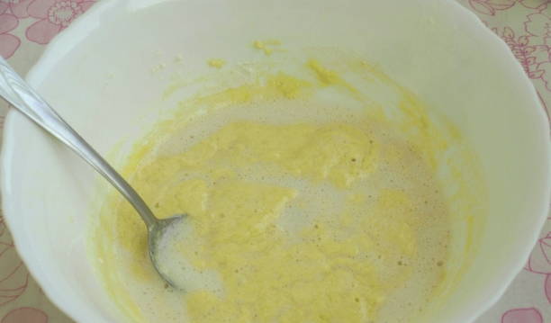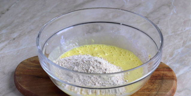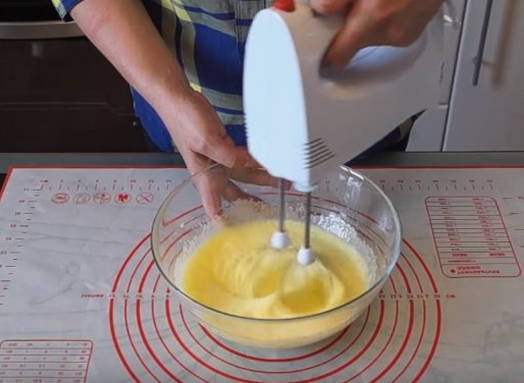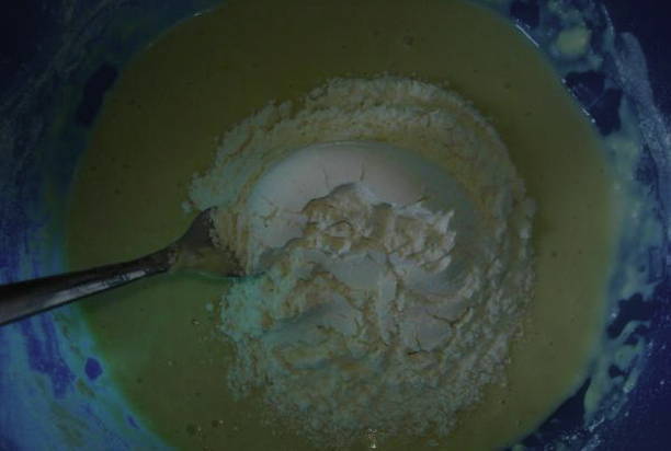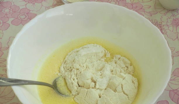 - Giet vervolgens melk in de dooiermassa, meng. voeg dan de gezeefde bloem en bakpoeder voor het deeg toe. Kneed tot een homogeen deeg.