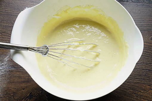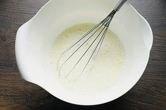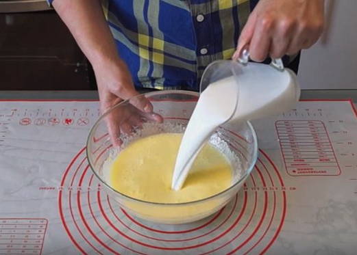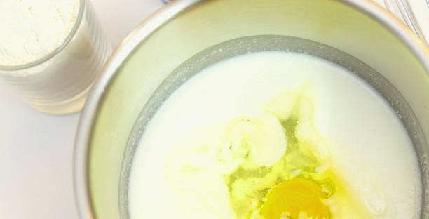 - Klop het ei met suiker, giet er melk bij kamertemperatuur en voeg zout toe, meng goed.
