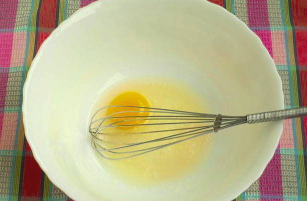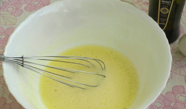 - Breek een ei in een kom, voeg zout en suiker toe, klop de ingrediënten goed door elkaar.