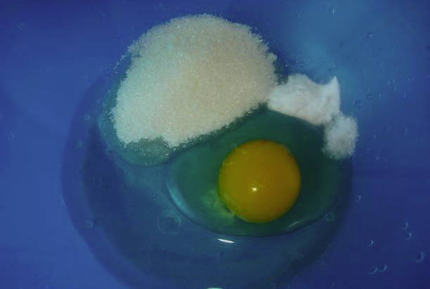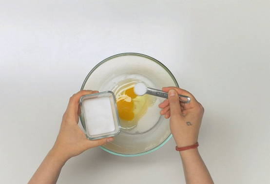 - Breek een ei in een kom, voeg suiker en zout toe. Klop de ingrediënten door elkaar.
