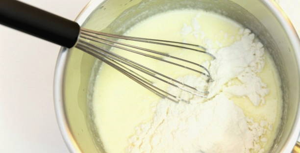 - Giet de helft van de melk erbij en voeg geleidelijk de gezeefde bloem toe, meng zodat er geen klontjes zijn. Voeg dan het tweede deel van de melk toe en meng goed.