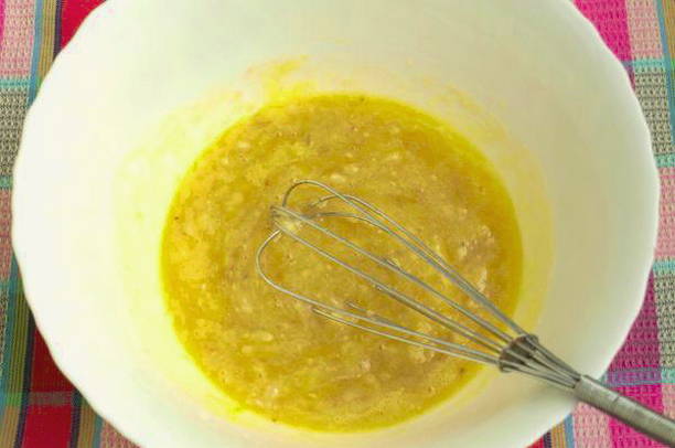 - Meng in een kom kefir, eigeel, plantaardige olie en bananenpulp.