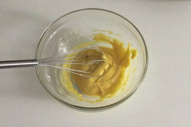 - Giet water in een kom, voeg de dooier toe en meng goed.