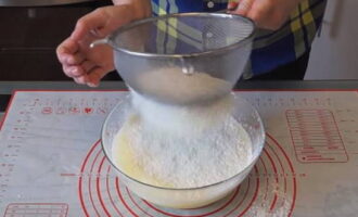 - Voeg vervolgens de gezeefde bloem en bakpoeder toe, kneed tot een homogeen deeg.