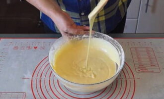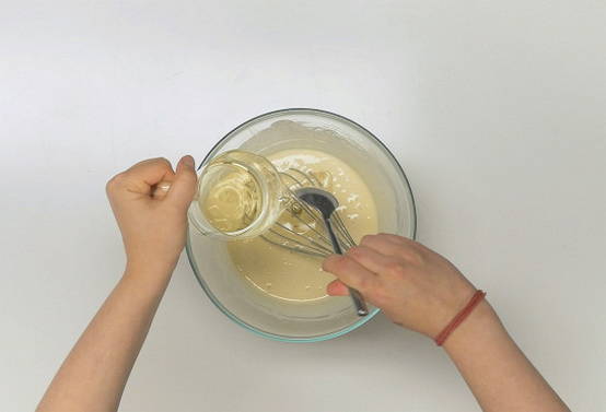 Verwarm de melk, maar kook deze niet. Voeg het toe aan de luchtige eimassa, roer. Giet vervolgens de plantaardige olie erin, meng opnieuw goed.