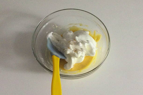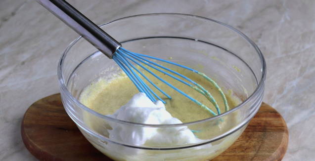 - Klop het eiwit tot een dicht schuim ontstaat. Voeg vervolgens de eiwitmassa toe aan het deeg en roer langzaam.