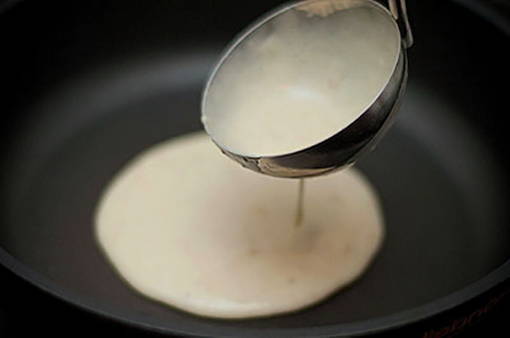 - Verwarm een koekenpan voor, giet er een kleine hoeveelheid deeg in en bak de pannenkoeken aan beide kanten.