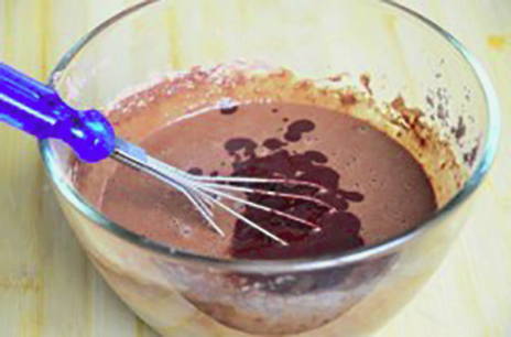 - Meng in een kom de gezeefde bloem, cacao, bakpoeder en zout. Voeg dan eieren en melk toe en roer.