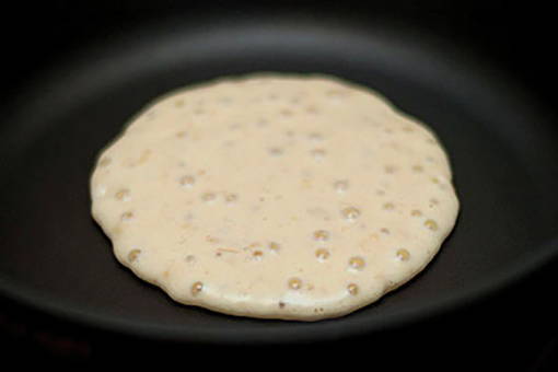 - Doe 2-3 eetlepels deeg in een droge voorverwarmde pan, vorm pannenkoeken en bak ze aan beide kanten goudbruin. Het vuur mag niet heel sterk zijn zodat de pannenkoeken goed gebakken zijn en niet aanbranden.