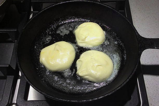 - Lepel het deeg uit met een eetlepel en vorm kleine ronde pannenkoekjes. Bak ze aan beide kanten goudbruin.