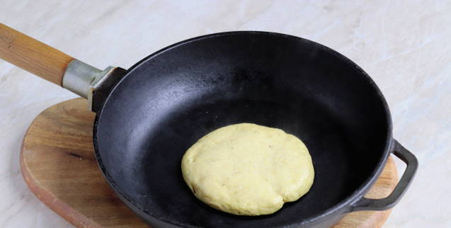 - Verhit een koekenpan, leg 2-3 eetlepels deeg in het midden en vorm een pannenkoek. Bak het aan beide kanten goudbruin.