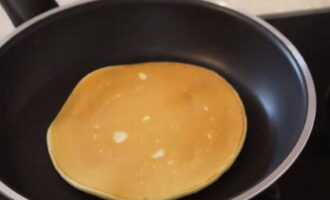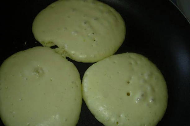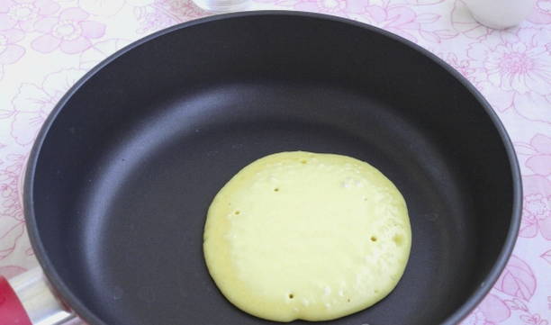 - Leg het deeg in een droge, hete koekenpan met antiaanbaklaag en vorm ronde pannenkoeken. Grill op middelhoog vuur, als er belletjes aan het oppervlak verschijnen, draai de pannenkoeken dan om en gril ze aan de andere kant.