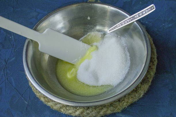 - Smelt de boter op laag vuur, voeg vanilline, zout en suiker toe.