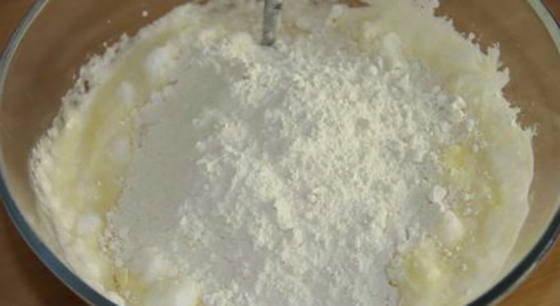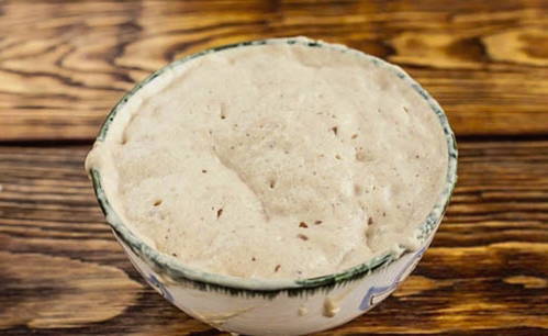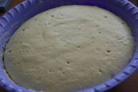 - Zeef 500 gram bloem, voeg zout toe. Giet de gistmassa bij de bloem, meng en laat het deeg 30 minuten op een warme plaats staan.