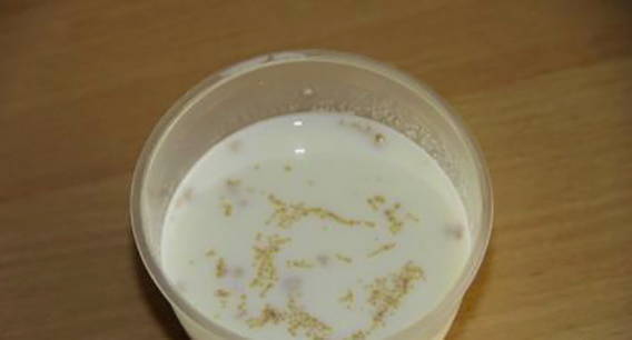 - Verwarm de melk tot 40 graden. Voeg een eetlepel suiker en gist toe aan 55 milliliter melk, roer en laat 15 minuten warm staan.