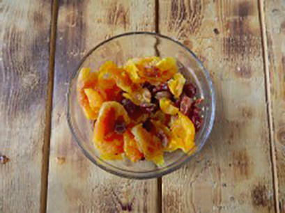 - Giet kokend water over gedroogd fruit gedurende 15 minuten, spoel het daarna af en droog het af. Snijd grote gedroogde vruchten in blokjes.