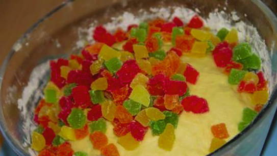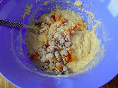 - Nadat het deeg is gegroeid, voeg je er gekonfijt fruit aan toe, meng je.