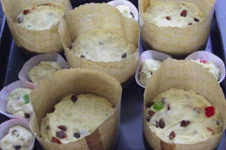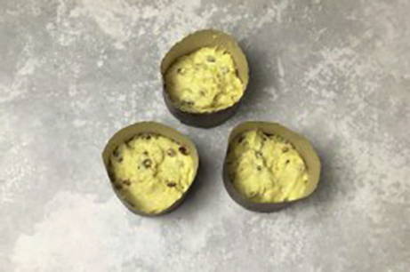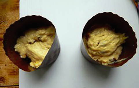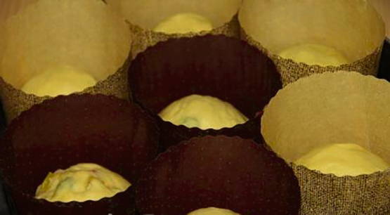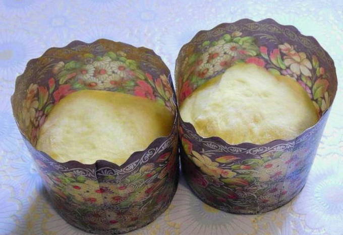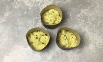 - Bekleed de vormen met bakpapier en bestrijk ze met plantaardige olie. Vul de vormen met deeg 1/3 van het volume, laat nog 15-20 minuten op een warme plaats staan.
