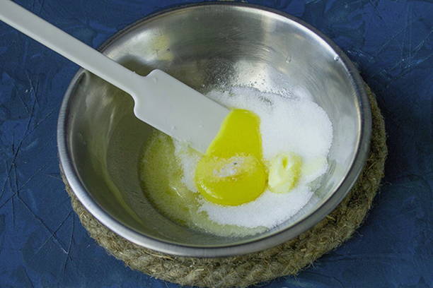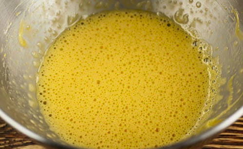 - Klop de eieren apart los in een kom met de resterende suiker, zout en vanille. Voeg vervolgens gesmolten boter toe aan een kom en roer.