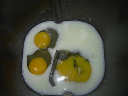 - Giet melk, gesmolten boter in een emmer van een broodmachine, breek eieren. Voeg vervolgens bloem, gist, zout, suiker en vanilline toe.