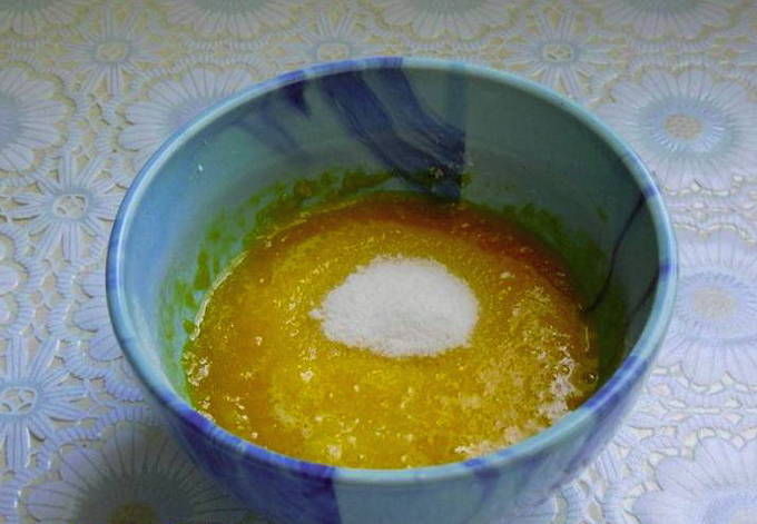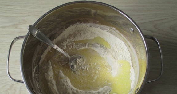 - Zeef bloem in een kom, voeg droge gist en vanilline toe. Giet melk, groente en gesmolten boter erbij, roer.
